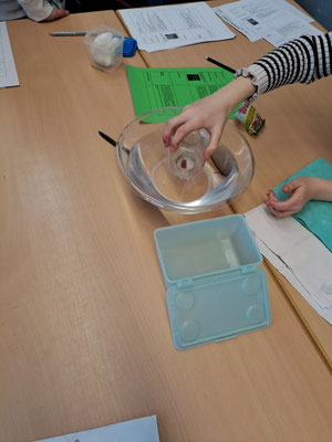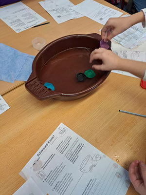 Im Sachunterricht wurde gemeinschaftlich experimentiert und geforscht. Zum Thema Wasser machten die Kinder zusammen Versuche ob etwas im Wasser schwimmt oder sinkt und fanden heraus was es mit der Oberflächenspannung von Wasser auf sich hat.
