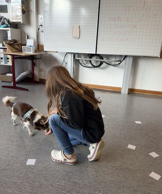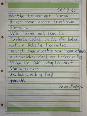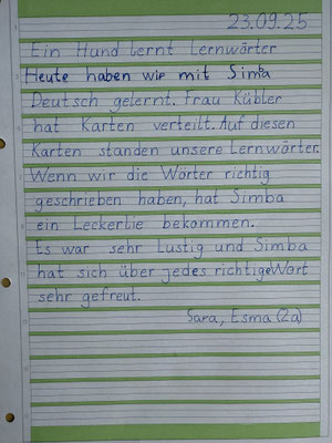 Heute haben wie mit Simba Deutsch gelernt. Die Klassenlehrerin hat Karten verteilt. Auf diesen Karten standen unsere Lernwörter. Wenn wir die Wörter richtig geschrieben haben, hat Simba ein Leckerlie bekommen.