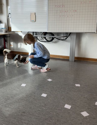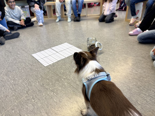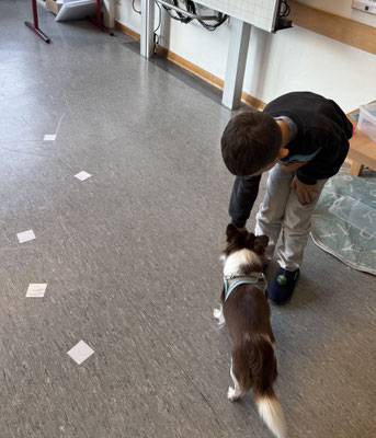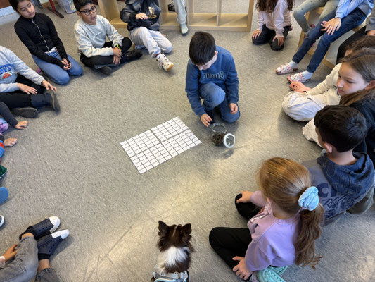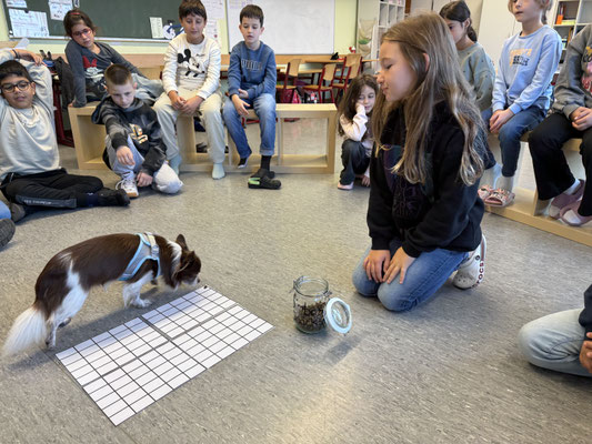 Wir haben mit ihm die Hundertertafel geübt. Wir haben auf die Tabelle Leckerlies gelegt. Dann mussten wir herausfinden auf welcher Zahl ein Leckerlie liegt: Wenn die Zahl richtig ist, darf Simba es essen. Uns hat es richtig Spaß gemacht.